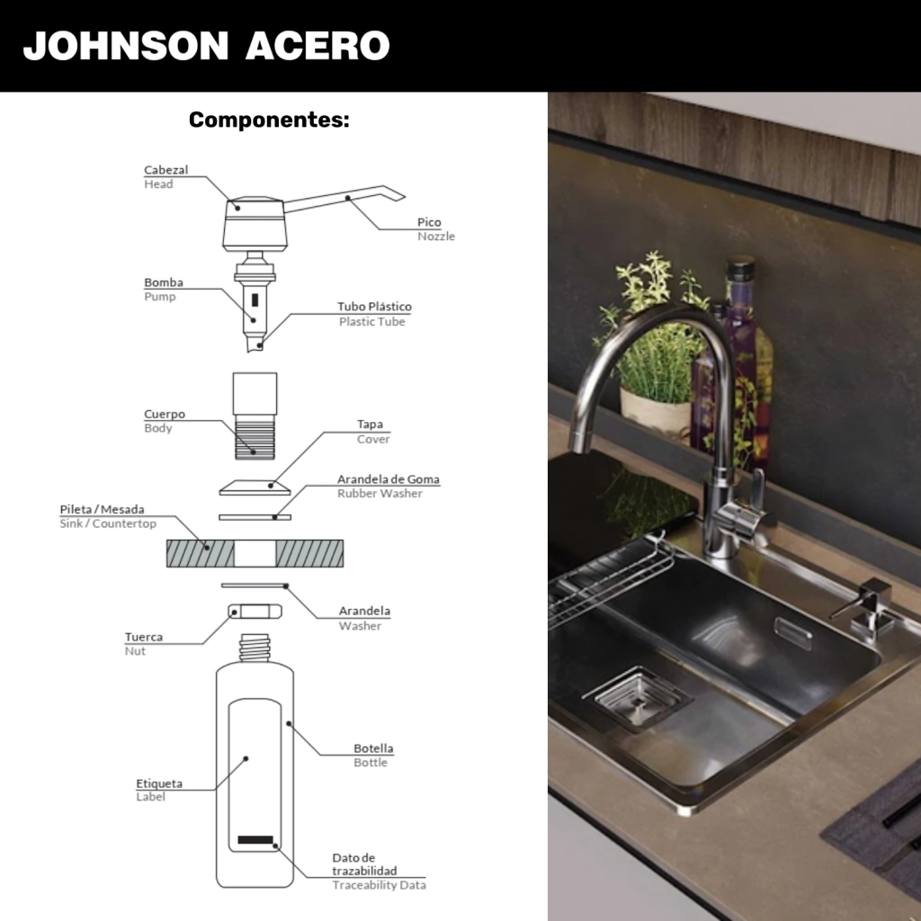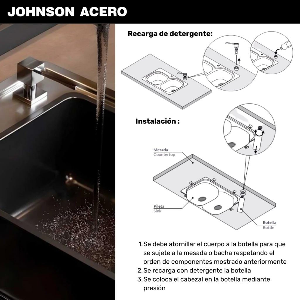 el Dosificador de Detergente Johnson Apidocu, un accesorio de alta calidad diseñado para mejorar la funcionalidad y estética de tu cocina. Ideal para modelos de piletas con líneas rectangulares.
